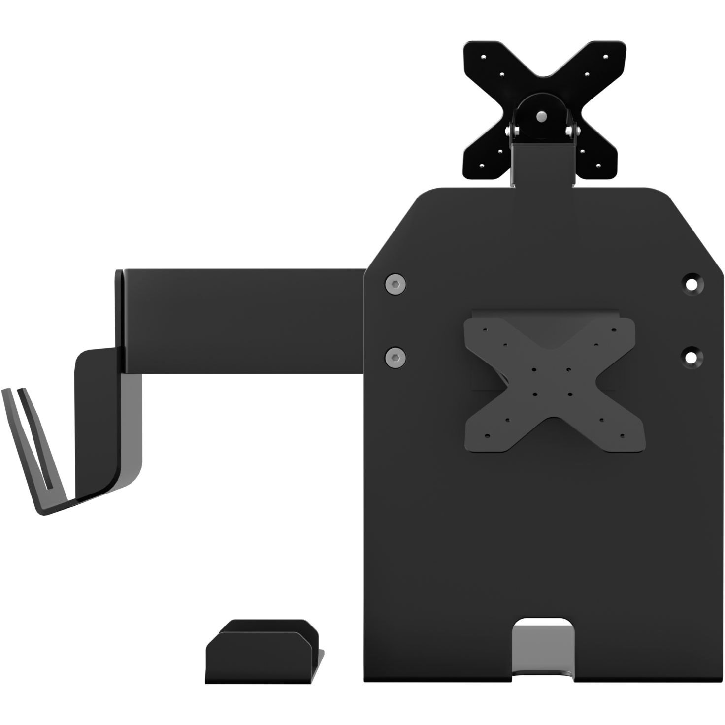 This countertop POS Station is a heavy-duty stand with dual VESA plates which can attach to CTA enclosures or anything with 7×75 or 100 x 100 VESA standard holes. It comes with a printer stand, a scanner holder and a universal card reader holder to provide a cohesive, efficient and compact POS system. The easily interchangeable metal bracket can be attached on either side of the stand for flexible adjustment. The scanner holder and card reader holder are easily attached on the stand & enclosures by magnetic pads, allowing them to be placed in different positions. The card reader holder is width adjustable to fit different size card readers. This stand provides a reserved space in the front to allow for a receipt printer option. This is the perfect addition for a point-of-sale location, retail store, warehouse set up and more.